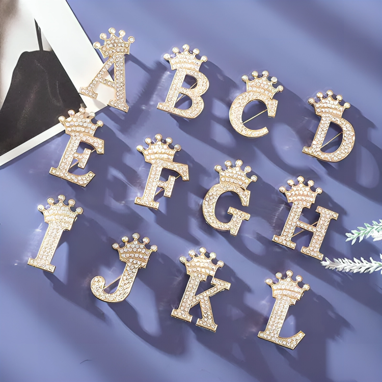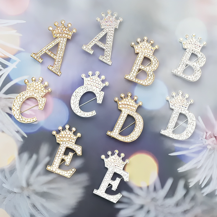 ড্রাগন ফ্যাশন ক্রাউনের পণ্যের বিবরণ 26 প্রাথমিক অক্ষর A থেকে Z ক্রিস্টাল কাঁচের ব্রোচ পিন মহিলাদের বিবাহের পোশাক ল্যাপেল কলার পিন গয়না